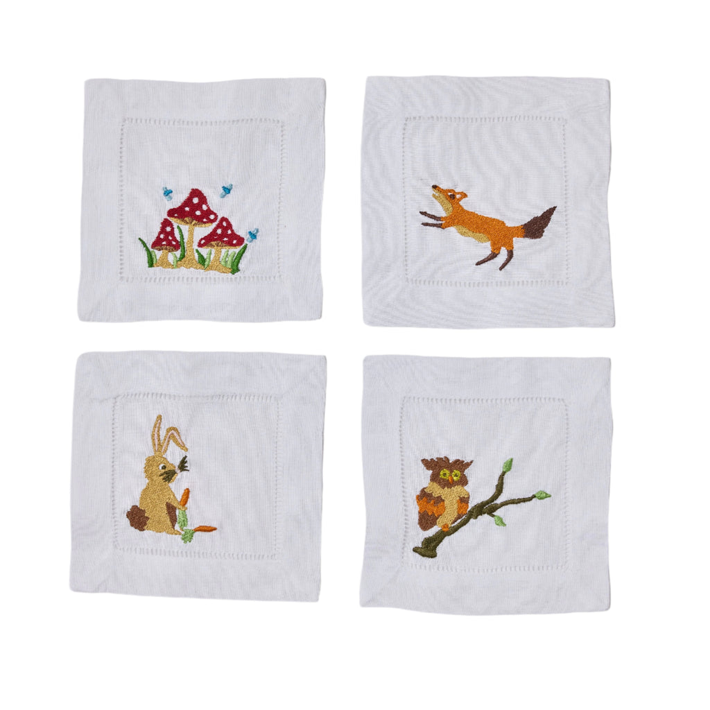 Originally from Asheville, North Carolina, Catherine Owen Design is an artist and designer based in Greenwich, Connecticut. After earning her design degree from Parsons, she honed her craft working for interior designer Katie Ridder Inc. in New York City. Inspired by her work on textiles and wallcoverings, Catherine founded her own brand, where she now specializes in custom commissions made for your home. The Assorted Woodland Creature Linen Cocktail Napkins, Set of 4 feature adorable little mushrooms, a fox, an owl, and a bunny. Ideal to adorn your tablescape for any get-together.