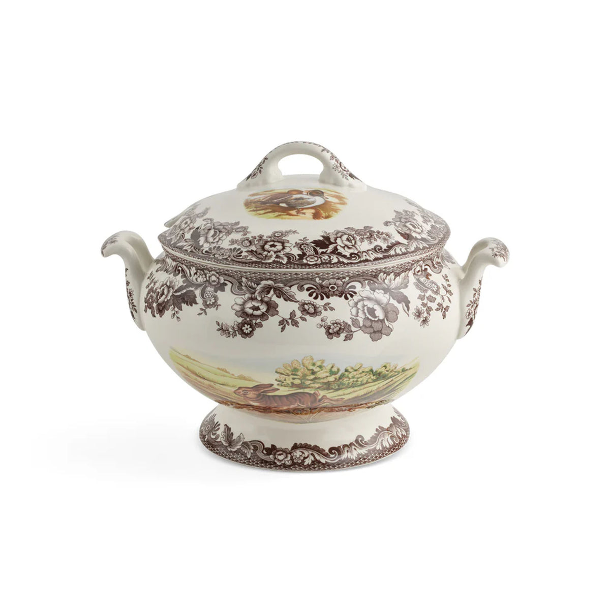 Founded by Josiah Spode in 1770, Spode has been producing the finest ceramics and celebrated designs in Stoke-on-Trent, England for 250 years. Spode is the authority on great British style bringing heritage style to modern day life. Woodland’s designs are rooted in the traditions of hunting for game and its elaborate presentation on the table. Central to the charm of the pattern are the striking studies of different animals framed by the British Flowers border which dates back to 1831. This Woodland Soup Tureen Cover features a Rabbit, Quail, & Pintail. Casually formal for every day living, this set is dishwasher and microwave safe.
