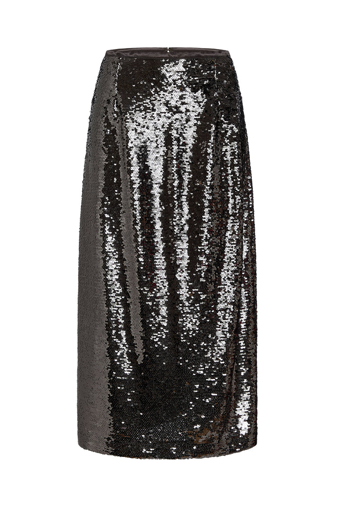 The Wray Skirt in Platinum delivers effortless glamour with a modern edge. Designed in a relaxed pencil silhouette, this shimmering statement piece is covered in platinum sequins that reflect the light beautifully with every movement. A satin waistband and fluid drape balance structure and ease, making it a versatile option for festive gatherings. Pair it with the Cecile Sweater in a complementary metallic knit for an elegant play on texture and shine.